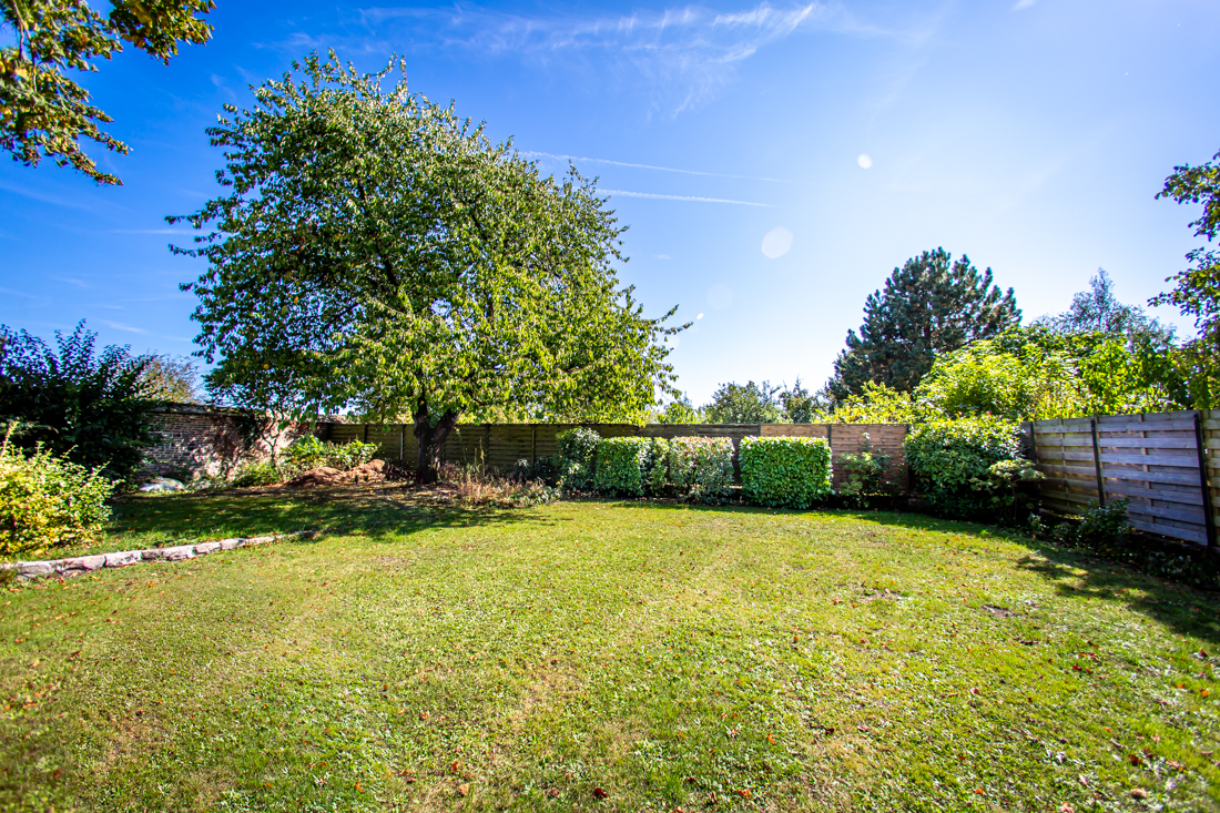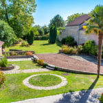 Jardin exposé Sud avec large terrasse ; pelouse ornementée