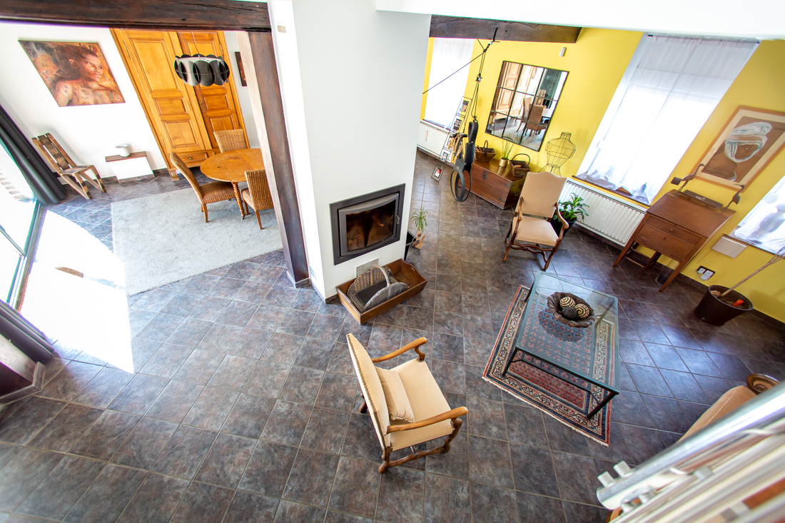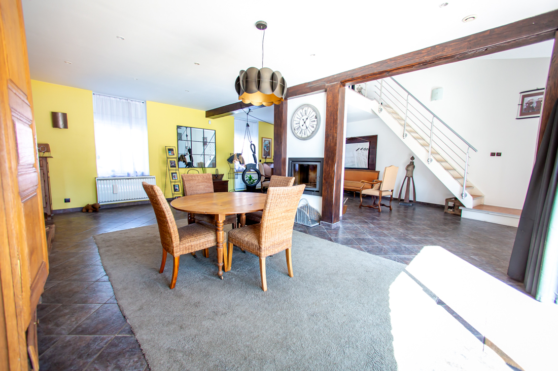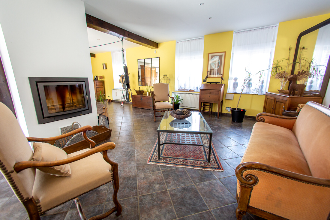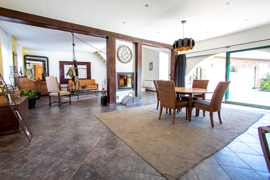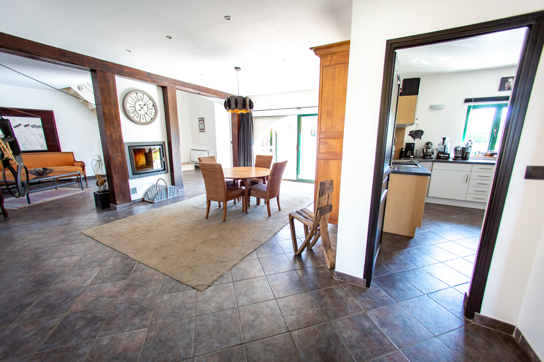 – REZ-DE-CHAUSSÉE : hall d’entrée ; séjour salon salle à manger avec poêle à bois double foyer et baie vitrée coulissante sur le jardin ; cuisine équipée dînatoire ; deuxième salon salle à manger avec parquet ; suite parentale avec chambre, salle de bain avec baignoire et pièce dressing ; 2 WC