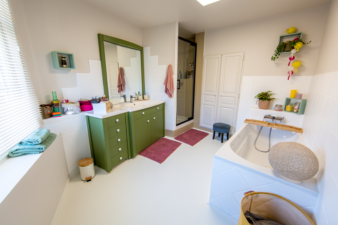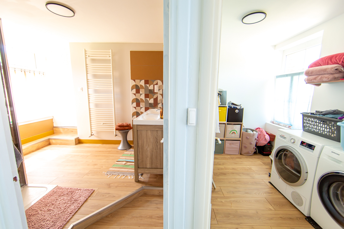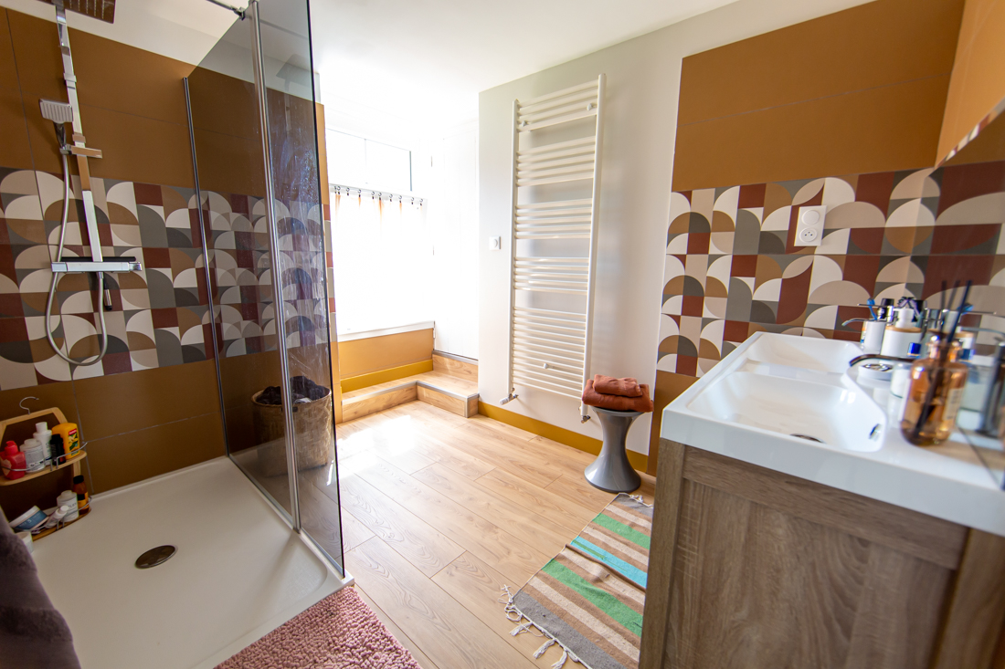 – Étage 1 : 3 grandes chambres ; 1 salle de bain avec douche et baignoire ; 1 salle de douche ; buanderie ; WC