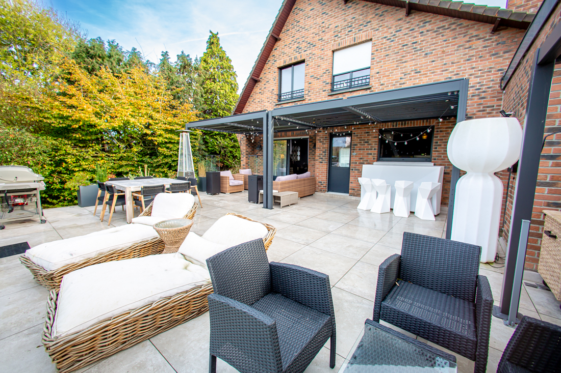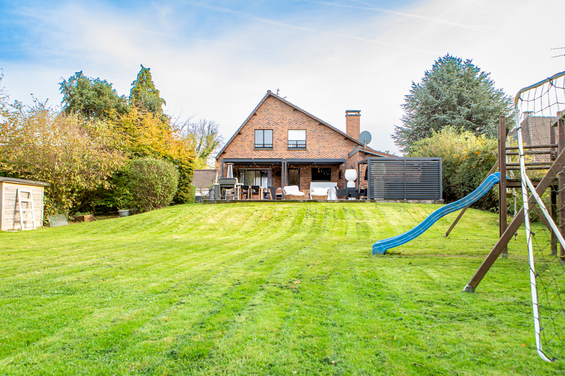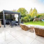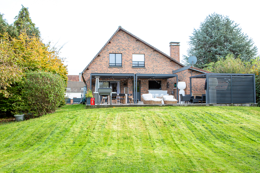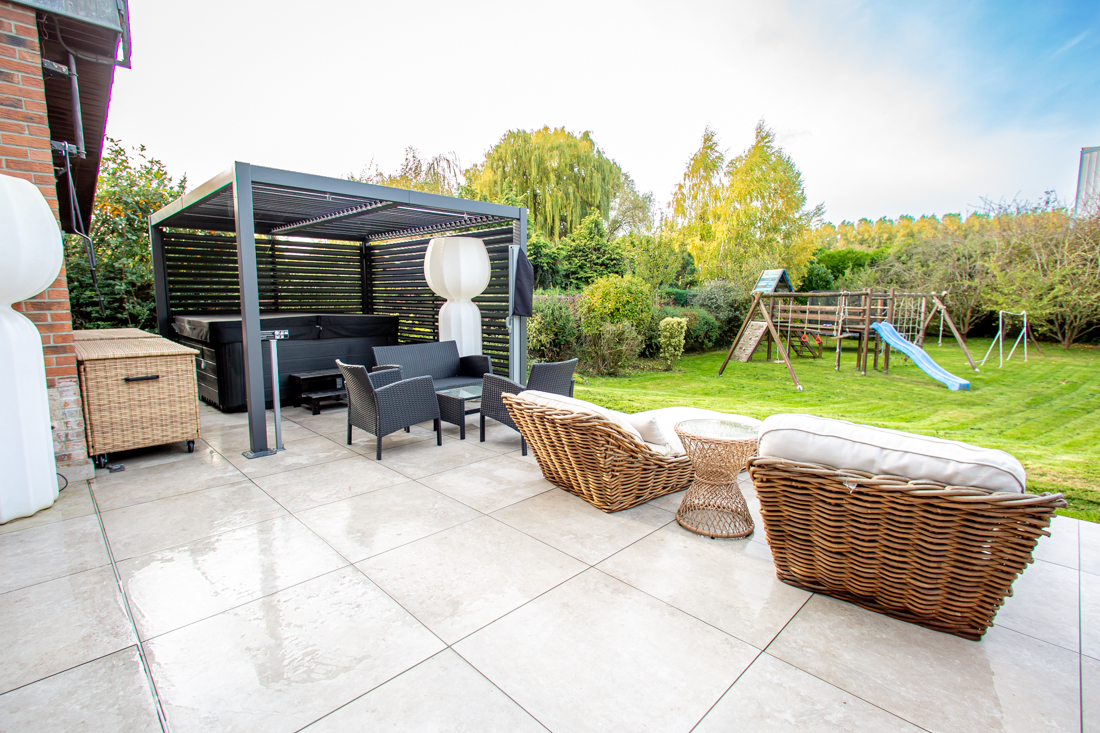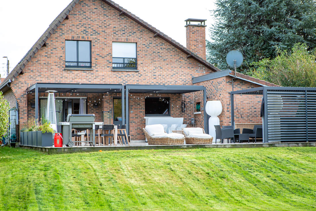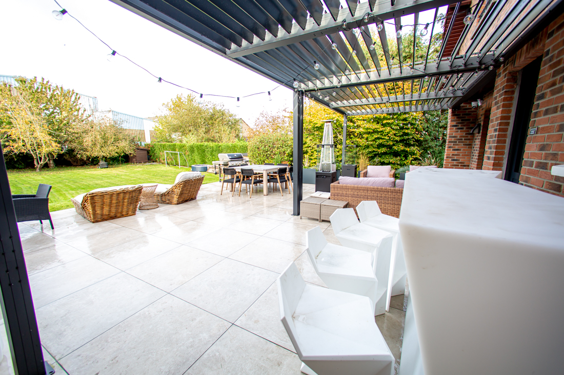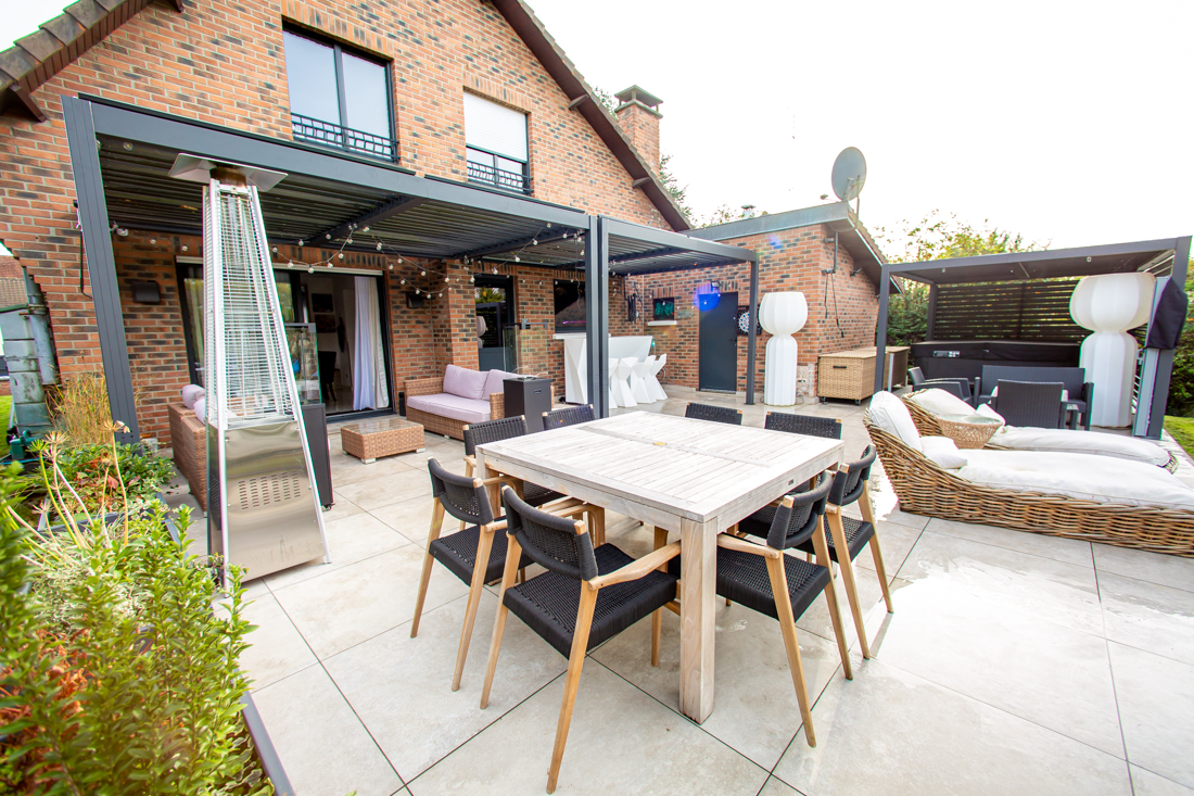 – à l’arrière : grande terrasse exposition Sud ; 3 pergolas bioclimatiques ; SPA ; jardin pelouse ; air de jeu enfants
