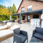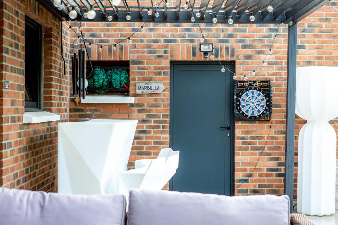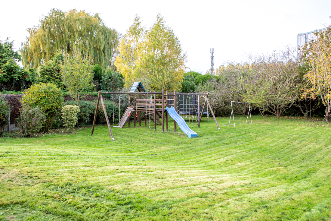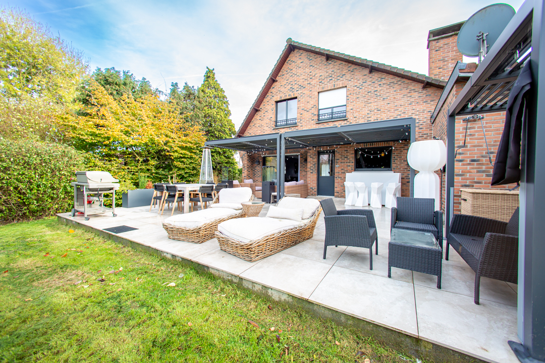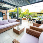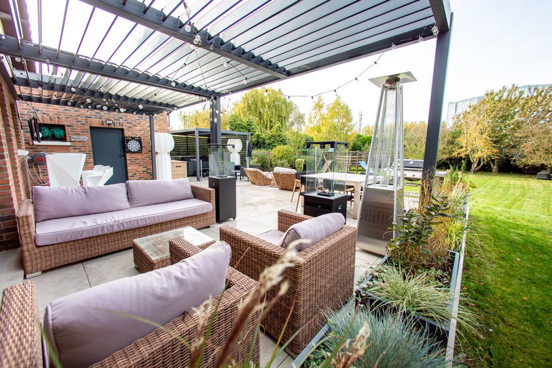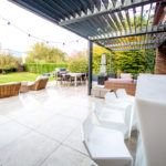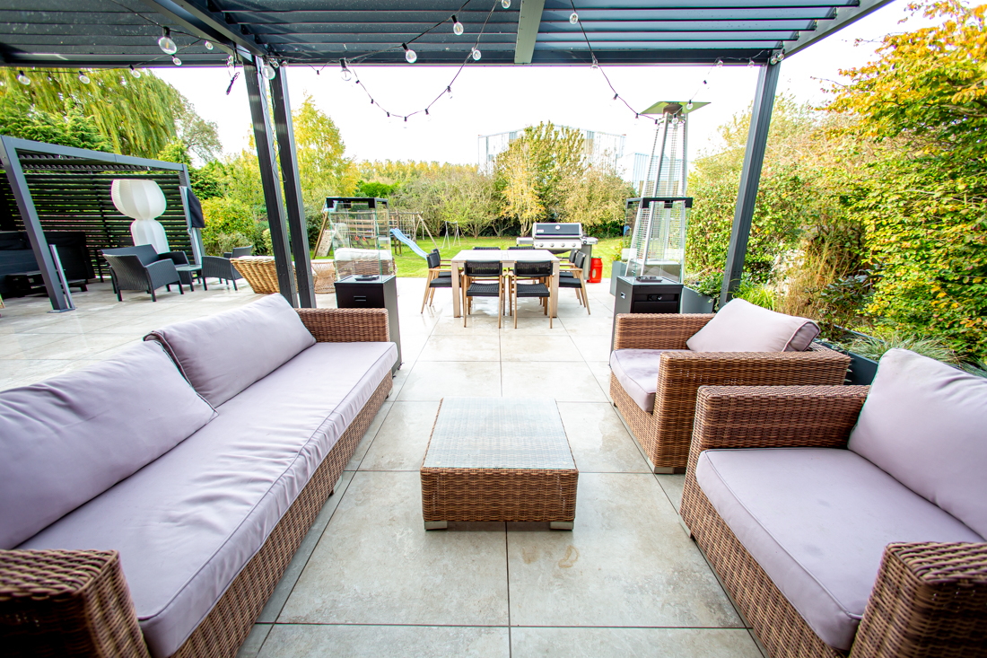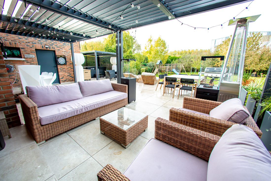 – à l’arrière : grande terrasse exposition Sud ; 3 pergolas bioclimatiques ; SPA ; jardin pelouse ; air de jeu enfants