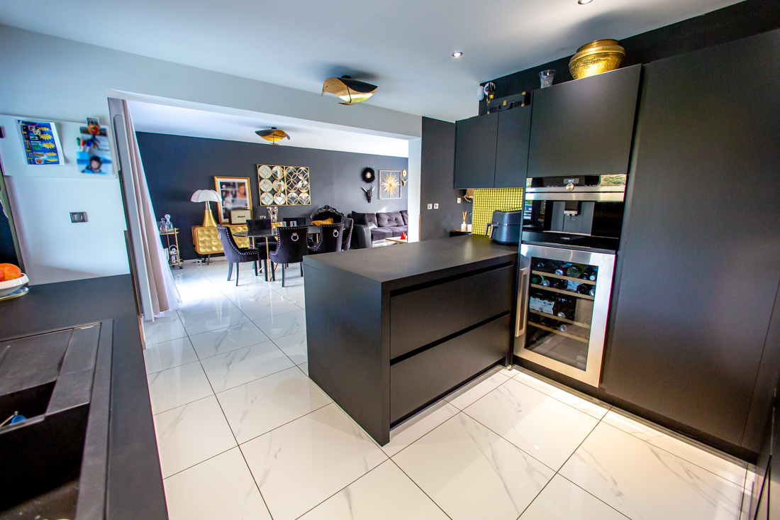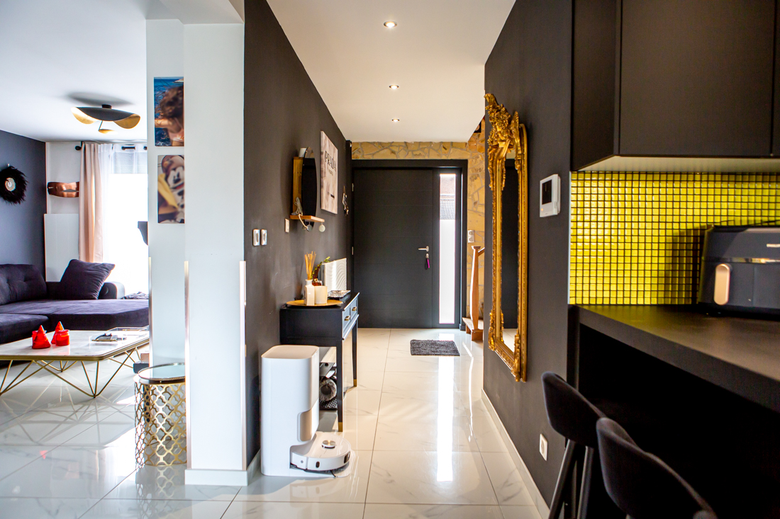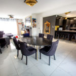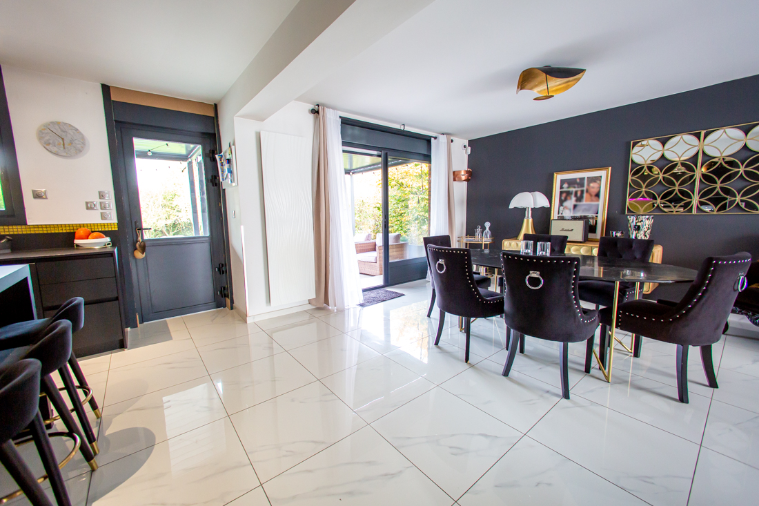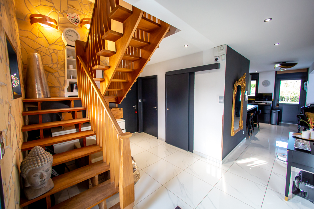 – Rez-de-chaussée : hall d’entrée ; salon, salle à manger avec baie vitrée coulissante donnant sur la terrasse, cuisine équipée belles prestations avec comptoir dînatoire ; buanderie ; chambre ou espace de réception libérale / commerciale ; bureau (possibilité salle de d’eau) ; WC