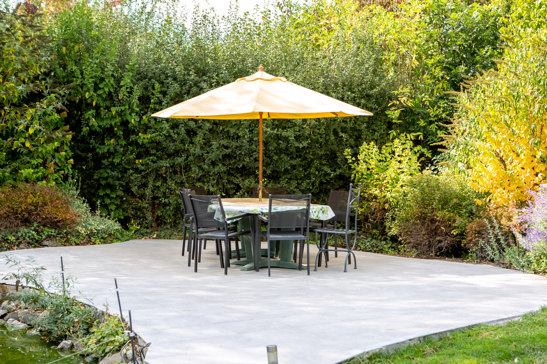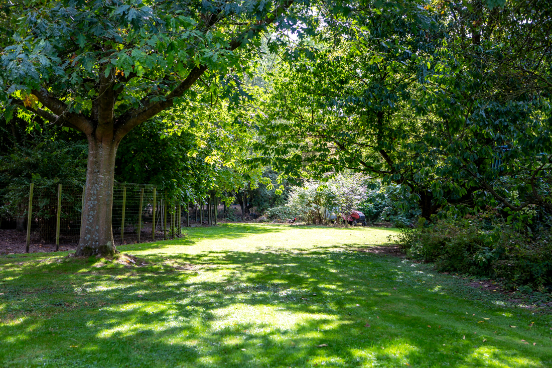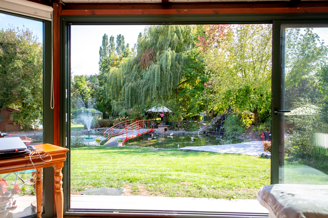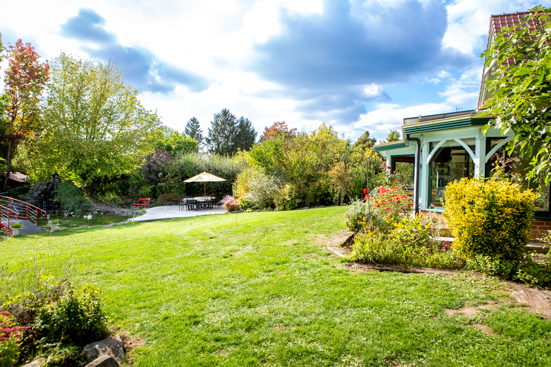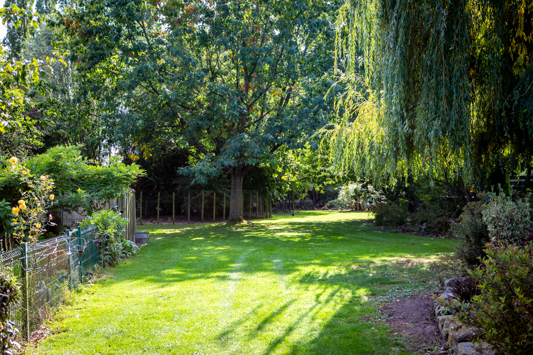 – À l’arrière : belle expo Sud ; jardin pelouse arboré et ornementé ; terrasse ;
