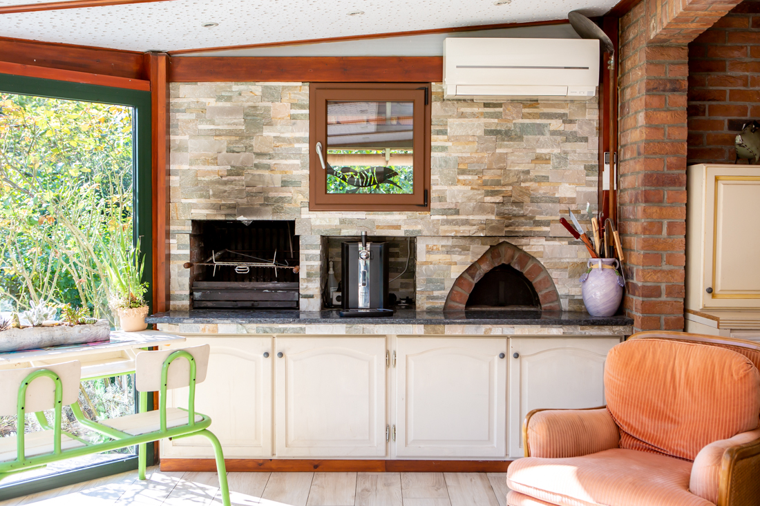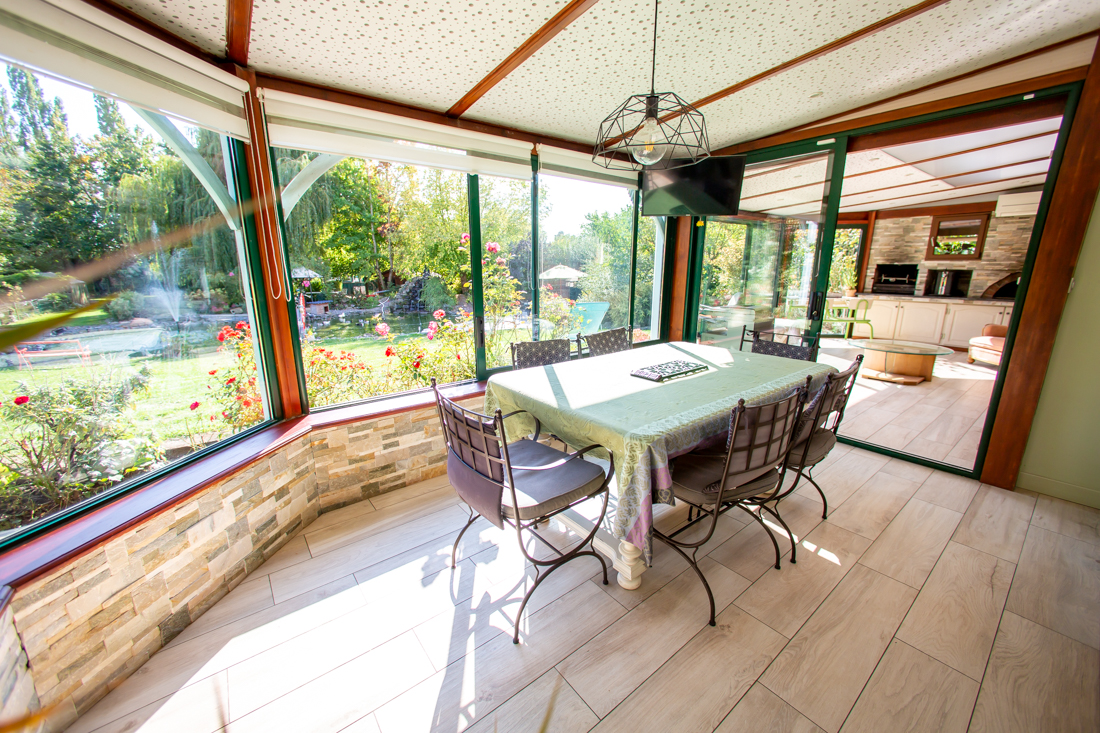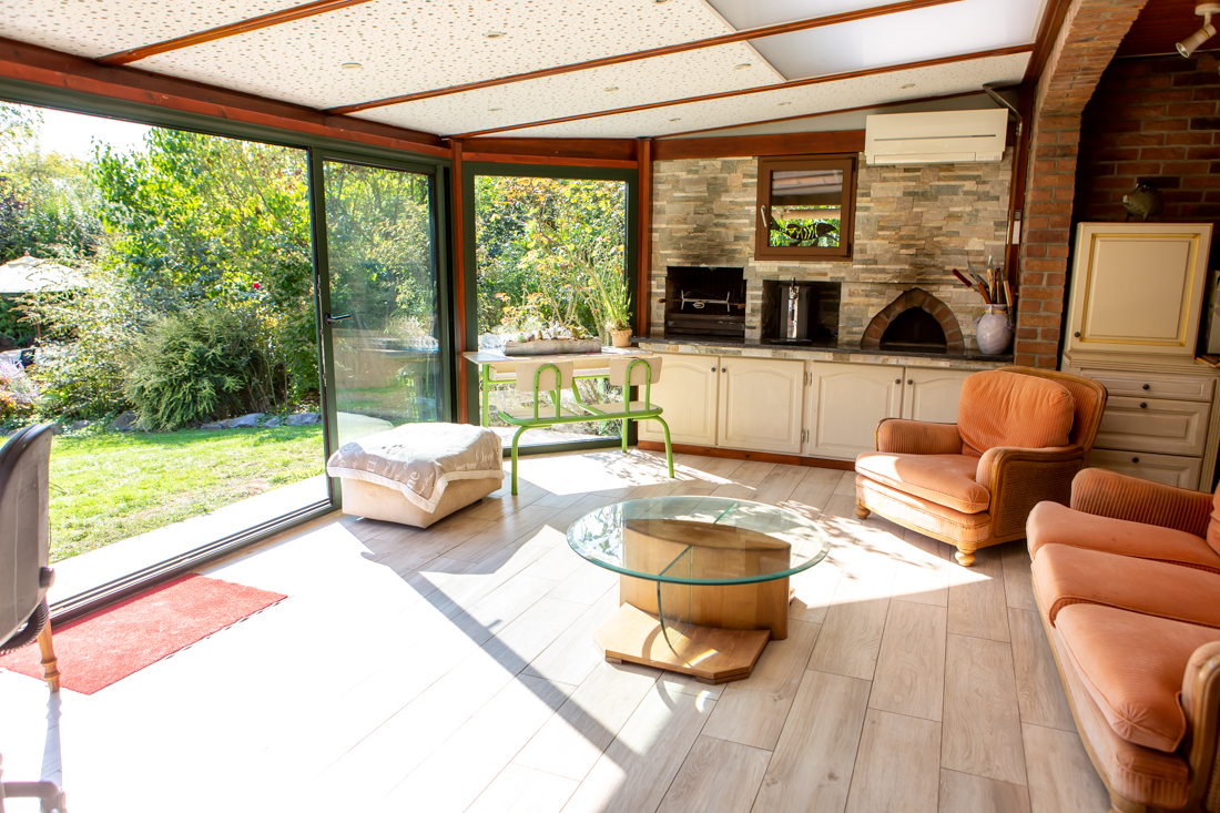 – Rez-de-chaussée : hall d’entrée ; séjour avec salon en piscine et insert à bois, salle à manger ; cuisine équipée ; pièce vitrée avec partie salle à manger et salon donnant sur le jardin avec four à pizza et barbecue intérieur ; chambre ; salle de douche ; WC ; accès cave
