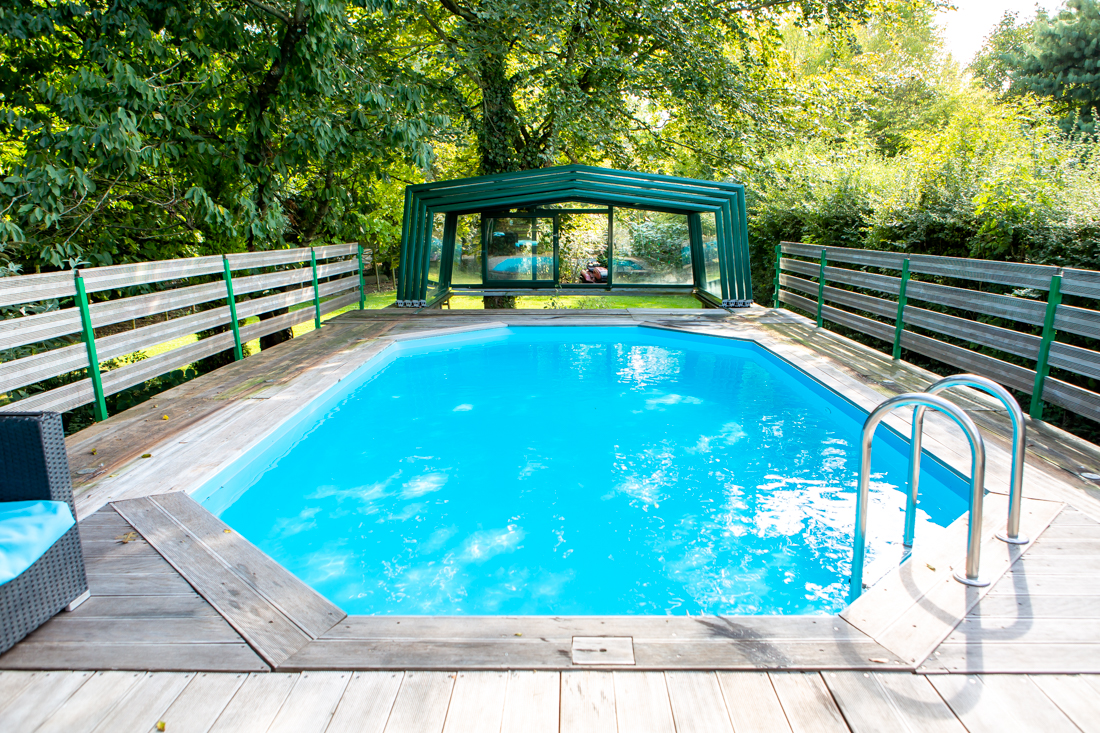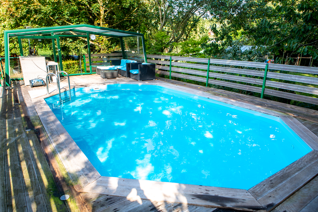 Piscine chauffée par PAC ; bassin ; terrasse de jeu ; abris de jardin ; enclos animaux